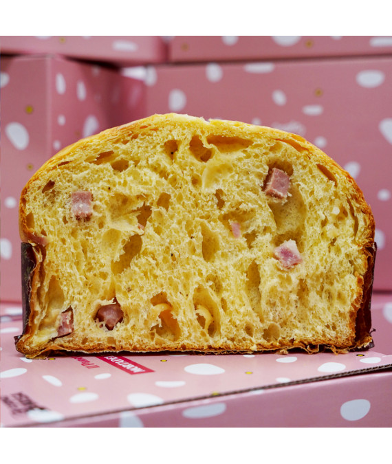 Prodotto dolciario da forno salato con mortadella e Parmigiano Reggiano - Ingredienti: Farina di GRANO tenero tipo 0, mortadella[carne di suino, sale, aromi naturali, ascorbato di sodio, nitrito di sodio], burro di centrifuga [crema di LATTE, fermenti lattici], acqua, zucchero, tuorlo d’UOVO, Parmigiano Reggiano [Latte, Sale, Caglio], pepe nero.